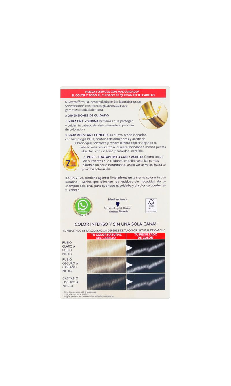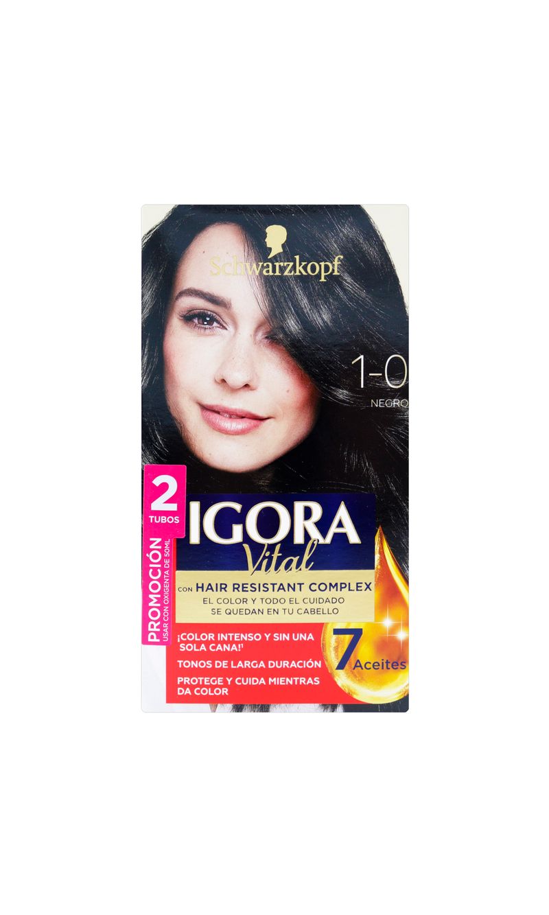 El Igora Vital Kit 1-0 Negro ofrece una coloración intensa, duradera y con cobertura total de canas. Su fórmula con aceite de almendras y queratina cuida el cabello durante el proceso de coloración, dejándolo suave, brillante y saludable. Este kit incluye 2 tubos, ideal para quienes tienen el cabello largo o desean retocar raíces con precisión.